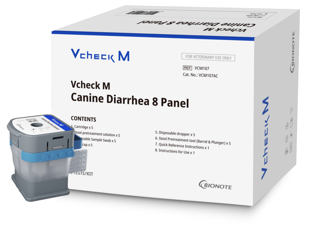Кат №.VCM107ACCanine Diarrhea 8 Panel, 5 тестов в набореНабор реагентов Vcheck M Canine Diarrhea 8 представляет собой мультиплексный тест ПЦР в реальном времени, предназначенный для использования с прибором Vcheck M10. Набор предназначен для качественного определения нуклеиновых кислот парвовируса собак, коронавируса собак, чумы собак, лямблий, Cryptosporidium canis, Salmonella spp., Clostridium perfringens, Campylobacter spp. (8 целевых патогенов) в фекалиях собак.